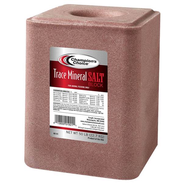 A specially formulated bag and block product designed to help meet the salt and trace element requirements of most livestock. Trace minerals complement the diet to help promote digestion, growth, maintenance of body tissues, proper reproductive processes, and general animal well-being. This salt product is intended for beef cattle, dairy cows, horses, goats and pigs. Trace mineral salt licks, in the form of blocks, are weather resistant for free choice feeding.