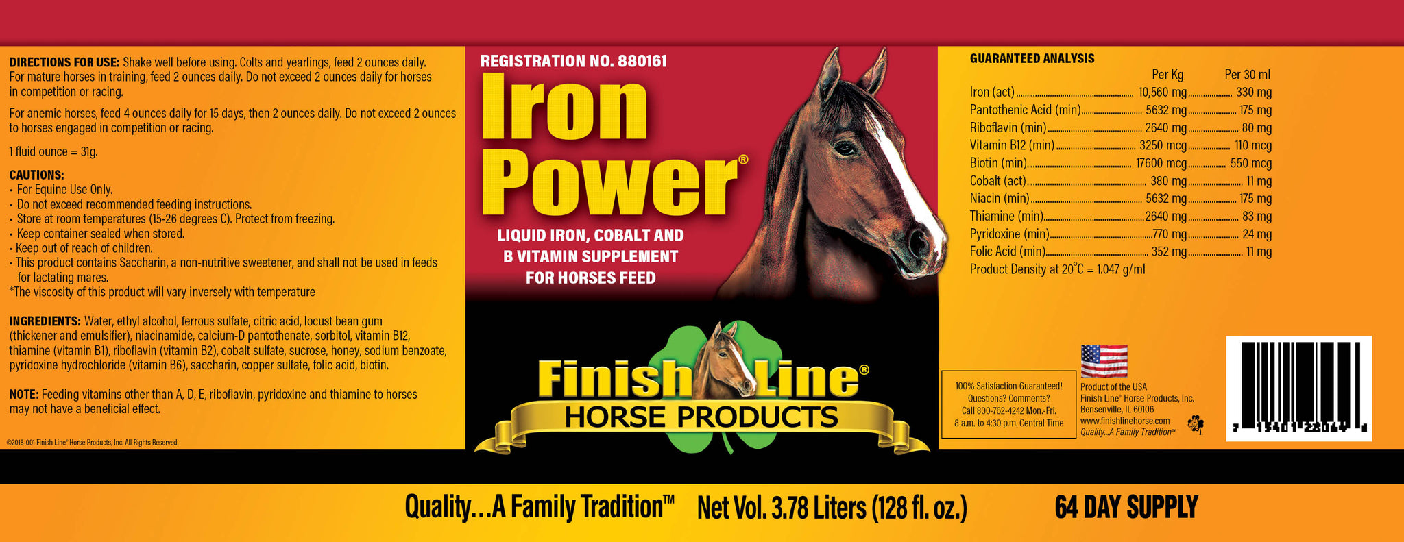 Iron Power® is used as an aid in preventing iron deficiency anemia. This daily supplement is a multi-vitamin / multi-mineral supplement with high levels of B-vitamin complex that support healthy blood counts in your horse. It will not make your horse hot or nervous when given as directed. It will increase red blood cell and hemoglobin counts after 42 days. Peak after 140 days and maintain good blood counts during training and exercise. You will experience fast recovery times after a race.