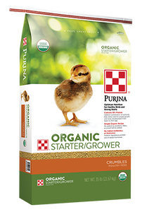 A nutritious, wholesome complete feed for young laying chickens from hatch to laying age (18-20 weeks). This complete feed is certified organic by the USDA and is made with non-GMO ingredients. Purina® Organic Starter-Grower feed will provide your birds with the proper levels of energy, protein (18%), vitamins and minerals that are perfect for a strong start and early hen development. Available in crumble form.