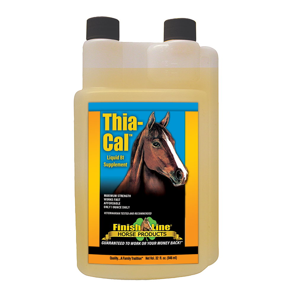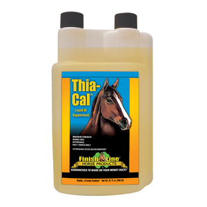 Thia-Cal™ promotes healthy nerves in your horse in a daily feed supplement. Available in liquid or powder forms. This is a potent Thiamine and Magnesium supplement balanced with Calcium. No tryptophan, no valerian root, and no kava kava are found in this product. Thia-Cal™ helps conserve energy while calming and settling your horse. This product will not make horses “dopey,” dull or pull from your horse’s performance.