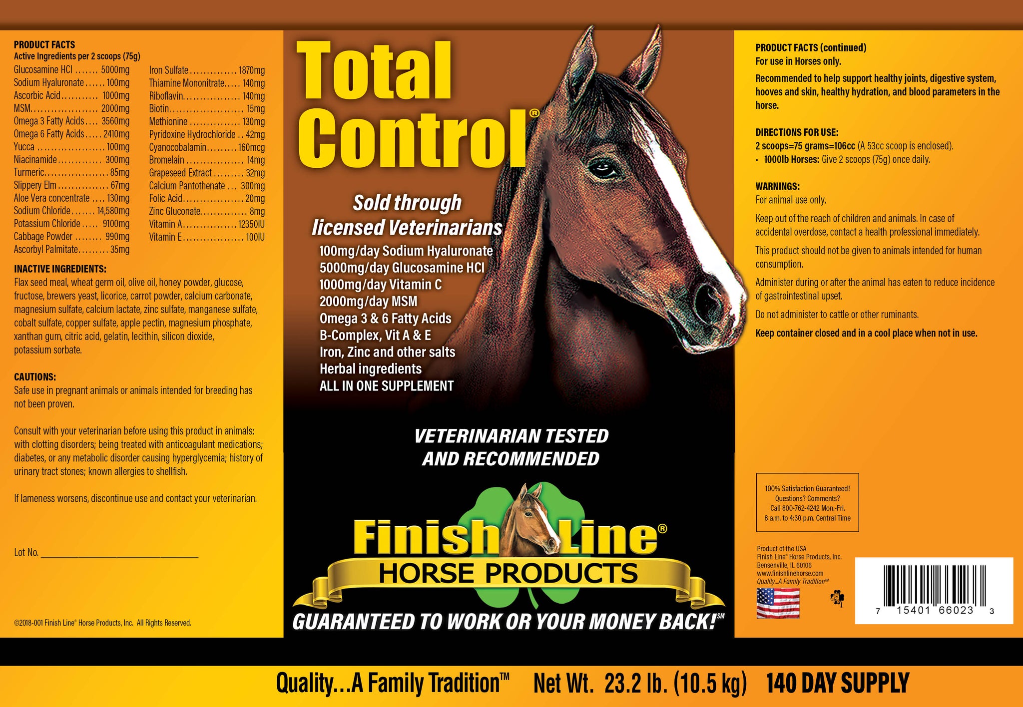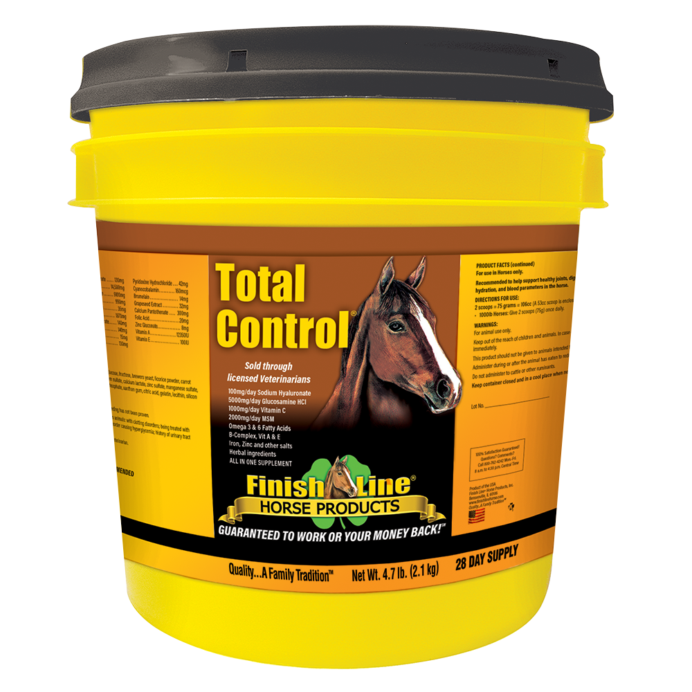 TOTAL CONTROL® is an all-in-one supplement designed with the performance horse in mind and is formulated to combine the active and quality ingredients of five Veterinarian Approved Finish Line® Horse Products: Apple-A-Day™, U-7™ Gastric Aid, Fluid Action® HA, Feet First® Coat 2nd, and Iron Power® – all into one palatable, daily supplement.