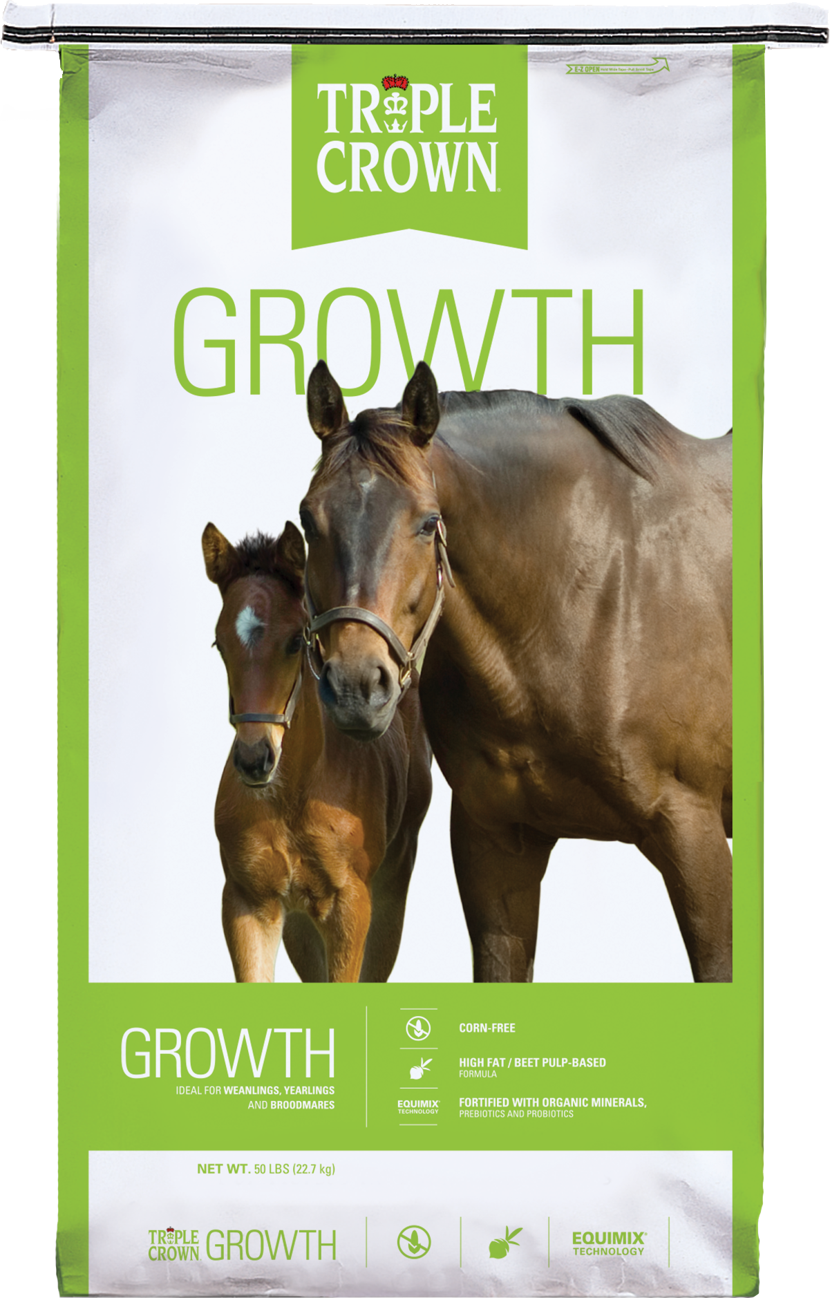 Triple Crown Growth is fortified to provide essential amino acids, vitamins, minerals, probiotics, enzymes and proteins essential to equine growth. Utilizing the latest research regarding nutritional support for growing horses, Triple Crown Growth provides more calories through quality fiber and fat, reducing the need for elevated levels of carbohydrates, which helps your horse experience a more consistent growth pattern and healthier joints throughout its life.