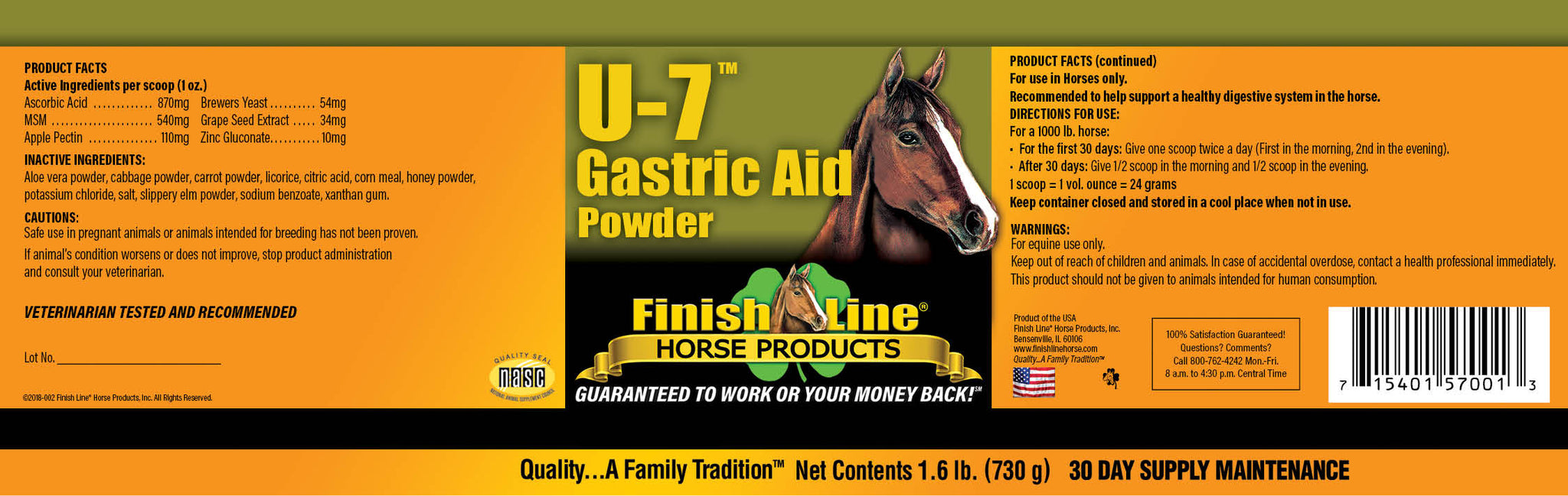 Our highly-palatable U-7™ Gastric Aid contains natural active ingredients that promote a healthy digestive tract. It helps eliminate undigested grains, maintain proper weight, reduce runny manure, increase coat quality, get rid of cinchy behavior, maintain a calm stomach and essentially keep your horse performing at its best!